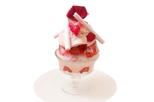 バラと同じ香り成分を持つライチのジュレとラズベリーを入れることで、バラの上品な風味をしっかりと引き出した、贅沢なパフェのようなかき氷です。