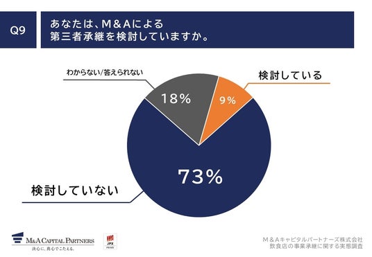 「Q9.あなたは、M&Aによる第三者承継を検討していますか。」(n=122)と質問したところ、「検討している」が9.0%、「検討していない」が73.0%という回答となりました。
