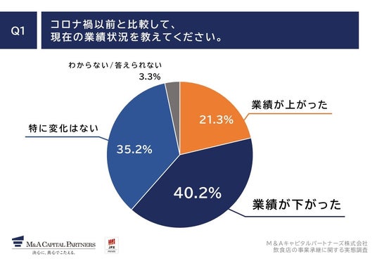 「Q1.コロナ禍以前と比較して、現在の業績状況を教えてください。」(n=122)と質問したところ、「業績が上がった」が21.3%、「業績が下がった」が40.2%という回答となりました。