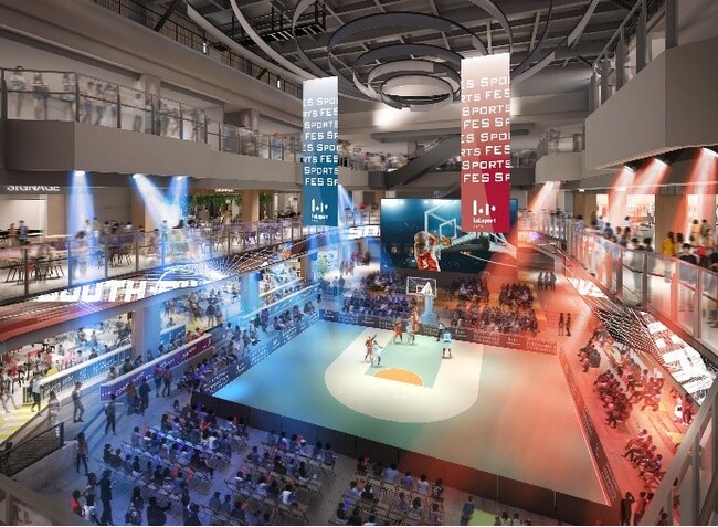 開催場所は、2022年11月8日(火)に開業予定の「三井ショッピングパーク ららぽーと堺」の中心に誕生するスタジアムコート「Fansta X Stadium(ファンスタクロススタジアム)」です。施設の大規模吹き抜け空間で屋内型の本格的なイベントが開催できるスタジアムコートで、スポーツイベントやショータイムのステージとなるほか、イベントを観覧しながら飲食を楽しめる「Sakai Food Stadium(サカイフードスタジアム)」など、全体で約2,500平方メートル の広さを誇ります。中央には国内商業施設の屋内型としては最大級の542インチのメインビジョンも設置し、大迫力のライブビューイングなどもお楽しみいただけます。また、「Fansta X Stadium」を取り囲むように2階壁面に設置されたリボンビジョンによって、本物のスタジアムさながらの臨場感を演出します。