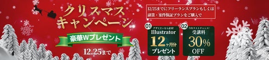 そこで「忍者CODE」では、Webデザイン学習に欠かせない「Adobe Illustrator」を12カ月分ご利用いただける特典を用意し、学習環境の充実と受講開始時の負担軽減を目的として、クリスマスWプレゼントキャンペーンを開催する運びとなりました。
