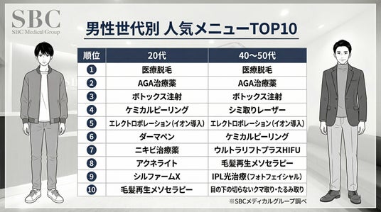 20代・40~50代男性の人気メニューTOP10(SBCメディカルグループ調べ)