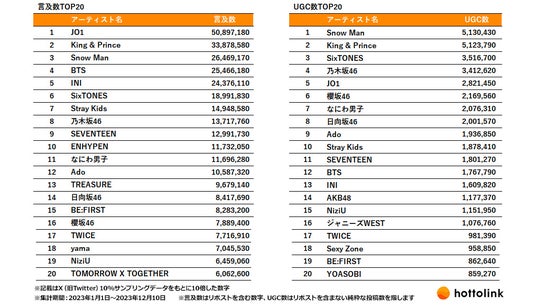 SNSマーケティング支援サービスを提供する株式会社ホットリンク(本社:東京都千代田区、証券コード:3680、代表取締役:内山幸樹、以下ホットリンク)は、X(旧Twitter)のデータを分析し、2023年にX上で話題になったアーティストを調査しました。