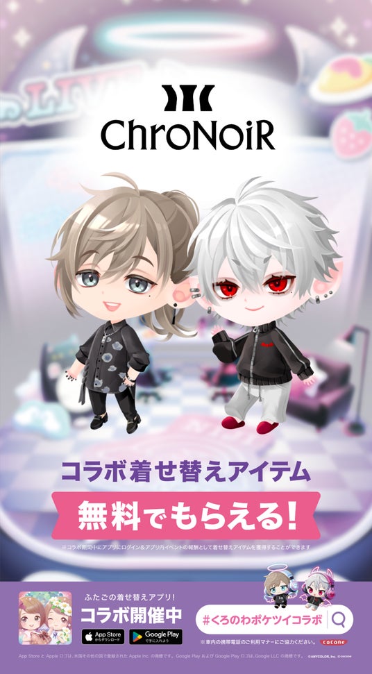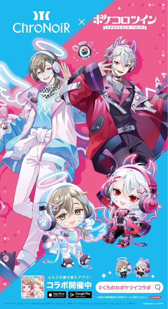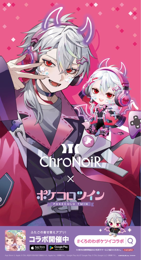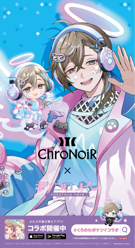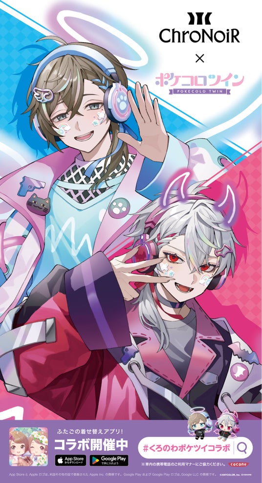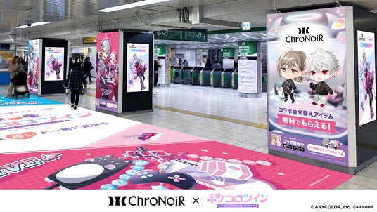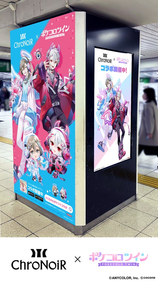 ココネ株式会社(以下「ココネ」)は、アバターの着せかえやお客様同士のコミュニケーションを楽しむスマートフォン向けアプリ『ポケコロツイン』は、VTuberグループ「にじさんじ」に所属する叶、葛葉による人気ユニット「ChroNoiR(クロノワール)」と開催中のコラボレーション企画を記念して、JR池袋駅改札外の中央通路に大型駅広告としてデジタルサイネージ広告およびポスター広告の掲出を本日より開始しました。