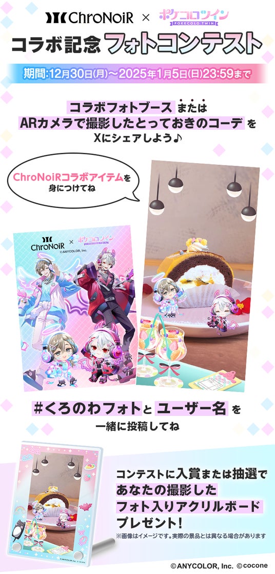 コンテスト入賞者および抽選で、特別なアクリルボードを総勢15名様にプレゼントします。応募方法は、「ChroNoiR」コラボアイテムでココロン(アバター)を着せかえ、コラボフォトブースまたはARカメラ機能を使って撮影したフォトを、指定された内容とともにXに投稿。プレゼントされるアクリルボードは、応募作品をもとにデザインされる世界にひとつだけのグッズです。