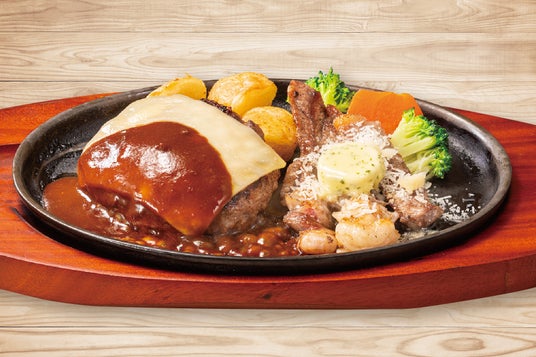 たっぷりチーズのチーズインハンバーグと、一口サイズにカットした初雪リブロインステーキを組み合わせた、チーズ好きの方におすすめのメニューです。