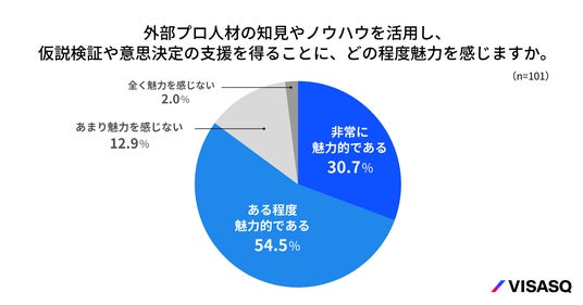 外部プロ人材の知見やノウハウを活用し、仮説検証や意思決定の支援を得ることに、どの程度魅力を感じるか尋ねたところ、「非常に魅力的」が30.7%、「ある程度魅力的」が54.5%で、合わせて約9割が魅力を感じていることがわかりました(n=101)