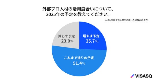 外部プロ人材の今後の活用予定について尋ねたところ、「増やす予定」が25.7%、「これまで通りの予定」が51.4%で、合わせて約8割が2024年よりも増やす、もしくは同様に活用予定であることがわかりました(n=74/外部プロ人材を活用した経験がある方)。