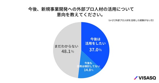 外部プロ人材の活用未経験の方へ、新規事業開発への活用について意向を尋ねたところ、「今後は活用したい」が37.0%で、約4割が活用意向があることがわかりました(n=27/外部プロ人材を活用した経験がない方)。
