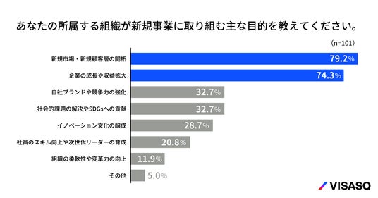 所属する組織が新規事業に取り組む主な目的について尋ねたところ、「新規市場・新規顧客層の開拓」が79.2%で最も多く、「企業の成長や収益拡大」が74.3%、「自社ブランドや競争力の強化」と「社会的課題の解決やSDGsへの貢献」が32.7%と続きました(n=101)。
