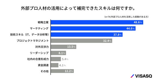 外部プロ人材の活用によって補完できたスキルについて尋ねたところ、「戦略立案」が48.6%と最も多く、「マーケティング」が44.6%、「技術スキル」が37.8%と続きました(n=74/外部プロ人材を活用した経験がある方)。