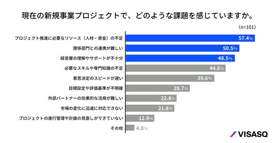 現在の新規事業プロジェクトで感じている課題を尋ねたところ、「プロジェクト推進に必要なリソース不足」が57.4%で最も多く、「関係部門との連携」が50.5%、「経営層の理解やサポートが不十分」が48.5%と続きました(n=101)。
