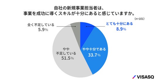 自社の新規事業担当者は、事業を成功に導くスキルがあるか尋ねたところ、「やや不足している」が51.5%、「不足している」が5.9%で、合わせて約6割が不足していると感じていることがわかりました(n=101)。
