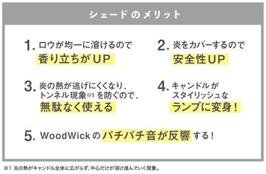 「WoodWickシェードM」は「ジャーM・トリロジージャーM」に被せることにより、木製芯の燃えるパチパチ音がシェードの中で反響するので、よりWoodWick特有の暖炉のような音をお楽しみいただけます。また、壁際に置けば、影絵のようにシルエットがゆらめきます。