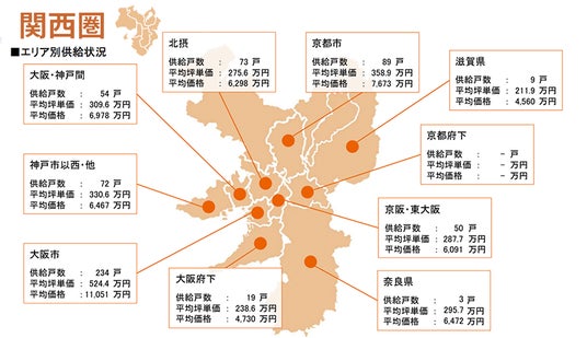 集計対象エリアは首都圏及び関西で、それぞれのエリア別相場情報、需給動向、着工件数等を集計しました。