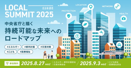 イシン株式会社(本社:東京都新宿区、代表取締役社長:西中 大史、証券コード:143A)が運営する公民共創の先進事例を紹介するメディア『自治体通信』は、2025年8月27日(水)、9月3日(水)の2日間にわたり自治体通信 LOCAL SUMMIT 2025「中央省庁と描く持続可能な未来へのロードマップ#エネルギー #都市計画 #災害対策 #こども #医療福祉」を開催いたします。