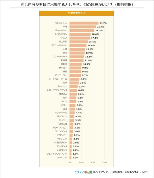 1位は「バドミントン」、2位は「卓球」、3位は「バレーボール」の順位になりました。どれも学校などで触れる機会のある競技で、親しみやすい競技が上位になっているとわかります。