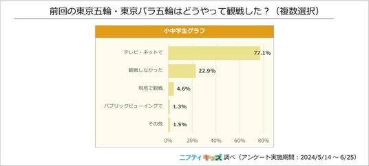 前回の東京五輪も、家のテレビやネットで観戦した人が約8割でした。観戦しなかった人は2割ほどで、今回のパリ五輪・パリパラ五輪に対してのアンケートとあまり大きな差はありませんでした。ただし、前回は国内開催だったため、現地で観戦した人の割合は少し多かったようです。