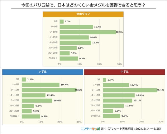 2021年に開催した「東京五輪」では、日本は史上最多の金メダル27個を獲得しました。小中学生ともに6~10個と予想する子どもたちが多い中、「30個以上」を期待する人もいました。