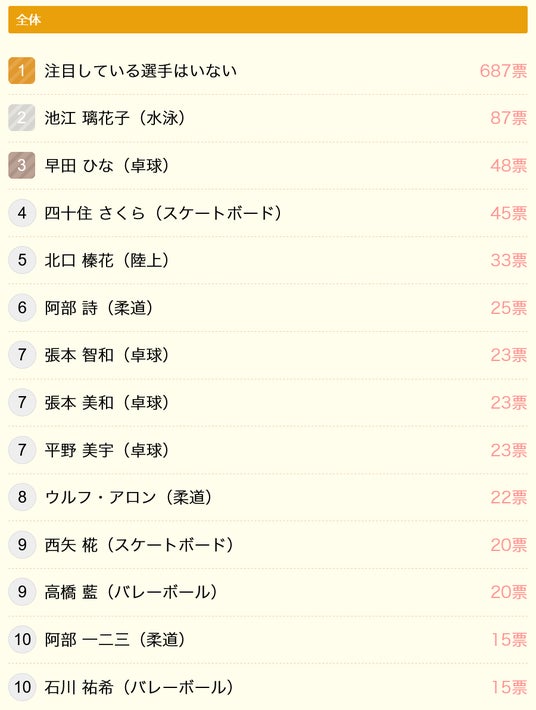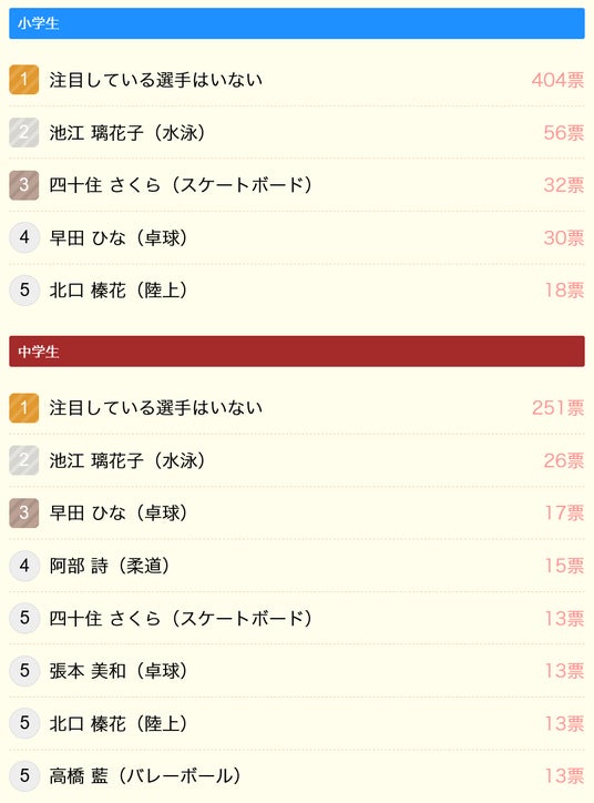 すべてのランキングで、「注目している選手はいない」の回答が最多でした。2位には小中学生ともに水泳の池江璃花子選手がランクインし、人気の高さがわかります。