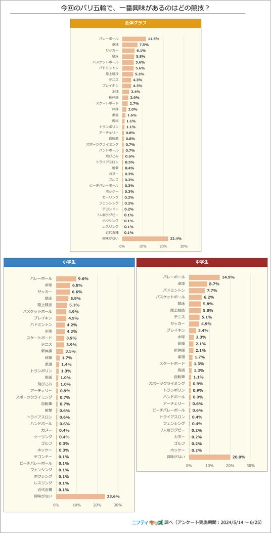 本調査では小中学生を中心とした子どもたちを対象に、今回のパリ五輪で興味のあるスポーツや注目している選手などについてアンケートを実施し、2,103人から回答を得ました。
