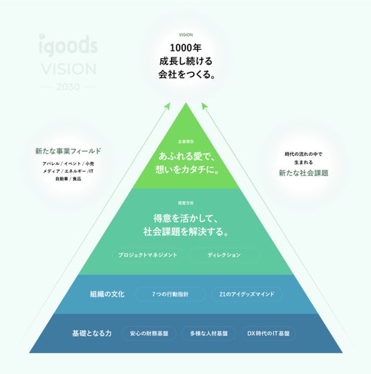 このような姿勢を体現する中長期の指針が「igoods VISION 2030」です。変化を前提に、柔軟かつスピーディに対応できる組織と仕組みを築きながら、事業や組織のあり方そのものをアップデートし続けることを目的としています。