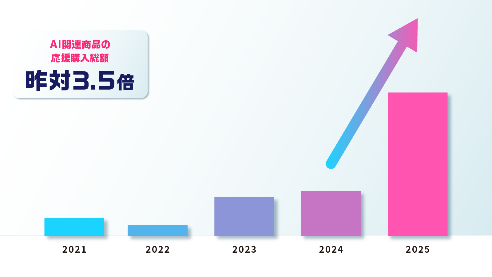 2024年比で、AI関連商品(※1)の応援購入総額は3.5倍、サポーター数は3.3倍に急増。平均応援購入単価も上昇傾向にあり、高付加価値なプロダクトへの期待が高まっています。