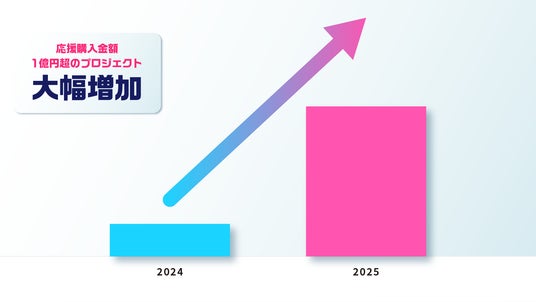 また、応援購入総額の多い大型プロジェクト数も伸長しており、1,000万円超のプロジェクト数、1億円超のプロジェクト数も大きく伸長しました。