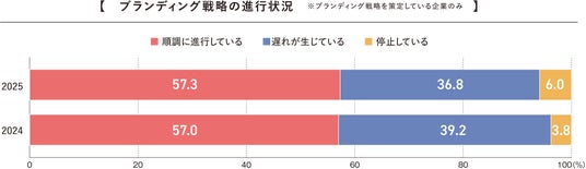 ブランド戦略を策定している企業の進行状況を見ると、「順調に進行している」と回答した企業は57.3%で、前年と近い水準が維持されております。戦略を着実に進められている企業は一定の割合で安定している一方で、「遅れが生じている」(36.8%)と「停止している」(6.0%)を合わせると約4割となりました。戦略推進に課題を抱える企業層が引き続き存在しており、推進の難しさがうかがえます。
