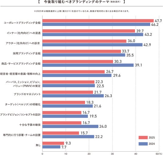 今後取り組むべきテーマとして最も多かったのは「コーポレートブランディング全般」(47.7%)で、企業の方向性や価値を明確にする取り組みに引き続き関心が集まっております。続いて「インナー(社内向け)への浸透」(39.7%)、「アウター(社外向け)への訴求」(36.0%)が挙がり、社内外への発信と浸透をバランスよく強化したいという意向が読み取れます。「採用ブランディング全般」や「商品・サービスブランディング全般」も一定の割合を占め、企業の成長テーマに応じて複数のブランド課題が併存している構造となっております。一方で、「専門的に行う部署・チームの設置」や「十分な予算の確保」などの体制面に関する項目は中位にとどまり、ブランド推進の基盤づくりは優先度が低い傾向がうかがえます。