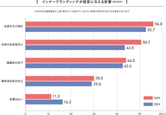 インナーブランディングが経営に与える影響については、2025年度調査でも「企業文化の強化」(56.0%)が最も高い割合となり、前年(52.7%)から3.3ポイント増加しました。これに続いて、「社員の生産性向上」や「離職率の低下」といった"組織パフォーマンス"に関わる項目も高い水準にあり、文化面と人材面の双方に影響が広がっている構造が見られます。一方で、「影響はない」という回答も一定数存在し、インナーブランディングの成果の捉え方には企業によって差があります。
