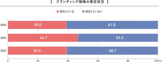 ブランド戦略を策定している企業は、2025年度の結果では39.0%にとどまる結果となりました。過去数年を通じても同程度の水準で推移しております。一方で、戦略を策定していない企業が6割超(61.0%)を占めており、基盤整備が十分に進んでいない現状が明るみになりました。
