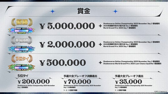 本イベントでは、2025年9月20日(土)、21日(日)に東京ビックサイトにて約6,000人が参加者として集まるShadowverse最大規模のオープン大会となっており、今回の優勝賞金は500万円となっています。この予選を勝ち上がる上位8名が10月に行われるGrand Finalsへ進む権利を得ることができ、『Shadowverse: Worlds Beyond』として初のRAGE優勝者を決定します。