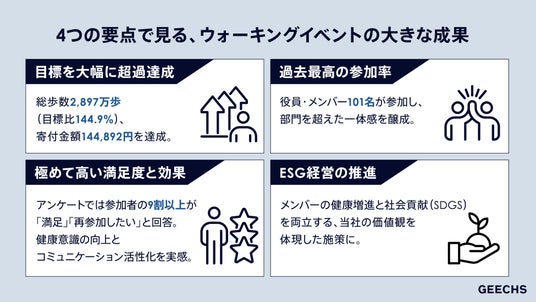 ギークスグループは、健康経営の取り組みとして、2025年11月に「ウォーキングイベント2025秋(チャリティウォーキング)」を実施しました。メンバーの健康増進とSDGs(社会貢献)を連動させる試みとして、「200歩につき1円」を寄付するというルールを初めて設定し、1ヶ月間取り組みました。その結果、総歩数28,978,432歩を記録し、144,892円を日本赤十字社へ寄付いたしました。