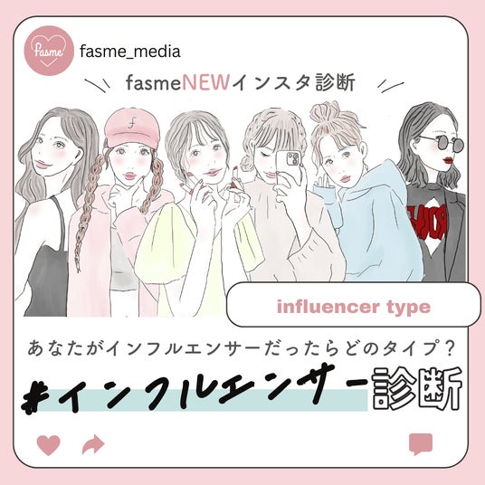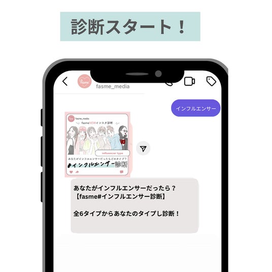 「fasmeインフルエンサー診断」は、「あなたが"インフルエンサー"として活動したら、どんなタイプか」が分かる、fasmeオリジナルの診断コンテンツです。fasmeのInstagramアカウントをフォローし、DMを使って診断します。
