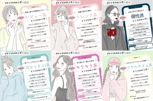 「fasmeインフルエンサー診断」には6つの診断結果があります。インフルエンサーとしての特徴や好きなもの、SNSでどんな投稿をしているか、タイプごとの「あるある」などを解説します。