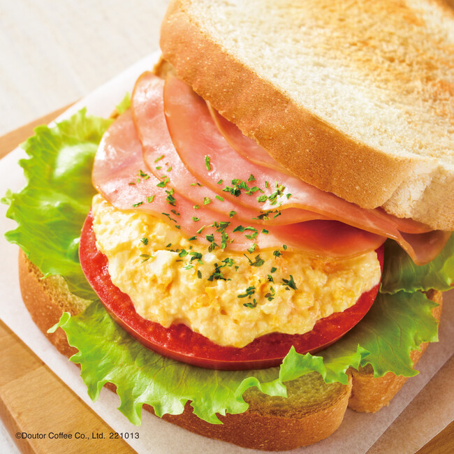 ハム・タマゴ・トマト・レタスといった、朝メニューの王道食材を組み合わせた人気のサンドイッチです。