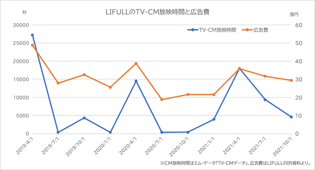 LIFULLのTV-CM放映時間と開示された広告費を四半期ごとに比較したグラフです。両者の増減は連動しており、TV-CMデータから企業の広告費を見積もることができます。