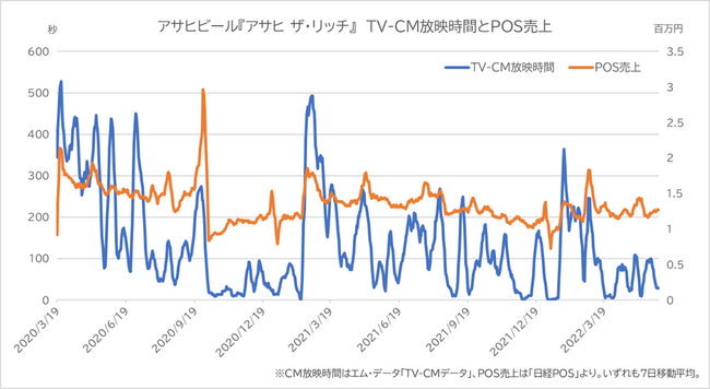 アサヒビール『アサヒ ザ・リッチ』のTV-CM放映時間をPOSの売上データと比較したグラフです。両者は概ね連動しており、TV-CMデータから企業の売上高を見積もることができます。