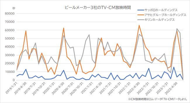 サッポロホールディングス、アサヒグループホールディングス、キリンホールディングスのTV-CM放映時間を比較したグラフです。エム・データのTV-CMデータは国内上場企業の銘柄コードに対応しており、各社のTV-CM出稿量(出稿時間、出稿回数)をタイムリーに把握できます。