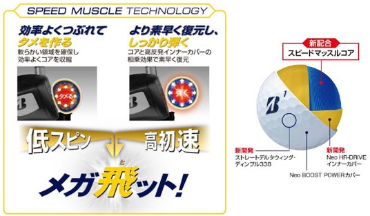 コアの内軟外硬設計のバランスを見直し、高初速化を実現しながら、打感の良さ・低スピン性能を継承した 「スピードマッスルコア」を採用。さらに反発性能の高い「Neo HR-DRIVE インナーカバー」を用いることにより、初速と弾き感がUPしました。