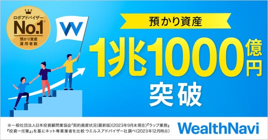預かり資産・運用者数 国内No.1ロボアドバイザー(※)「WealthNavi(ウェルスナビ)」を提供するウェルスナビ株式会社(本社:東京都渋谷区、代表取締役CEO:柴山和久、以下「ウェルスナビ」)は、2016年7月の正式リリースから約7年7カ月となる2024年3月4日時点で、預かり資産1兆1,000億円を突破したことをお知らせします。なお今後、預かり資産の開示は1,000億円単位といたします。