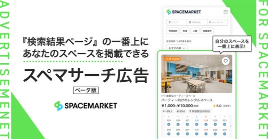 あらゆるスペースを貸し借りできるマーケットプレイス「スペースマーケット」を運営する株式会社スペースマーケット(本社:東京都渋谷区、代表取締役社長:重松大輔、以下、スペースマーケット)は、ホスト向け検索連動型広告サービス「スペマサーチ広告(ベータ版)」の販売を2025年8月8日(金)より開始することをお知らせいたします。本サービスにより、ホストは自身のスペースをスペースマーケットの検索結果ページ最上部に掲載でき、新規予約の増加や認知度向上を支援いたします。
