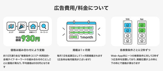 - 「エリア × ︎利用目的 × ︎︎会場タイプ × ︎キーワード」の約10万通りの検索結果に対し出稿可能