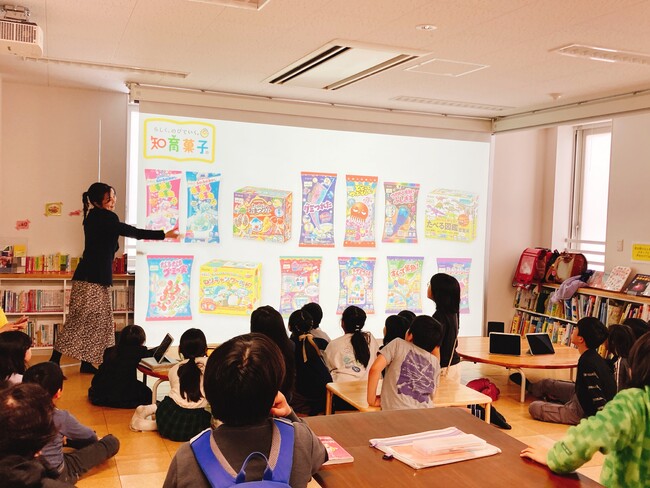 「ねるねるねるね」などの商品写真を用いて、知育菓子(R)の魅力について紹介いたしました。知育菓子(R)は2021年にリブランドを行い『こどもの自己肯定感を育てるお菓子』として、個性を伸ばす、失敗を楽しむ、違いを尊重するという三つの価値を提供しています。子ども達は説明が始まるとともに写真に近づき、「作ったことがある、これが好き!」など、大歓声の中でテストがスタートしました。