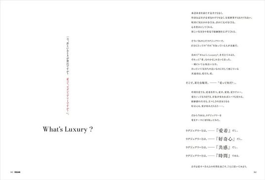 本号の特集は「Luxury」をテーマにモノ・コト、そして価値観を提案してきた。豊かな気持ち(=Luxury)になれるのは、モノにも、そしてそれを分かち合う相手に対しても、愛があってこそ。