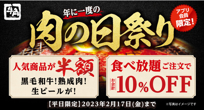 コロワイドグループの株式会社レインズインターナショナルが展開する牛角では、2月9日の年に一度の肉の日にちなんで牛角アプリ会員様限定で人気メニューが何皿何杯頼んでも半額になる “肉の日祭り”を開催します。