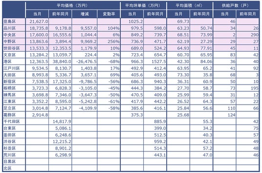 東京23区の各行政区毎に、平均価格、平均坪単価、平均面積、供給戸数をまとめました。当月の平均価格が大きい順に表示しています。