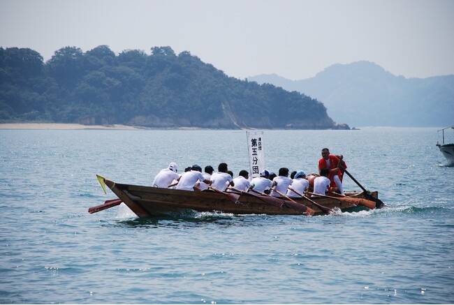 櫂伝馬とは海での情報伝令の役目を担った木造船で、14人の漕ぎ手が独特の掛け声と太鼓で調子を合わせ、心を一つにして櫂の動きを合わせることで前進する仕組みです。その後、当初の役割から神事としての意味合いを持つようになり、今では祭礼行事に伴う競漕へと趣が変化しています。