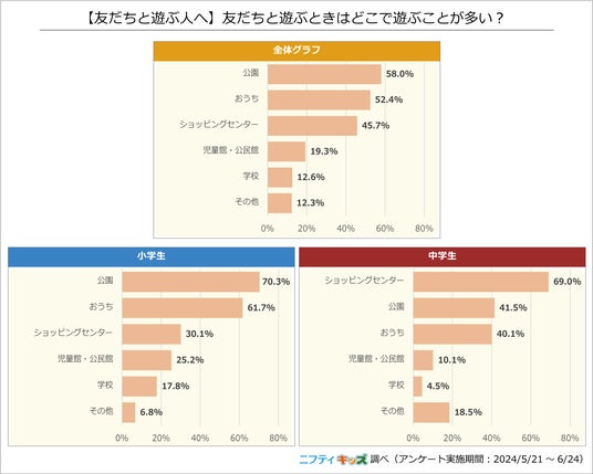 一方、中学生では「公園」「おうち」の割合が低くなり、「ショッピングセンター」が1位でした。小学生よりも行動範囲が広がるため、商業施設などで遊ぶ機会も増えるようです。